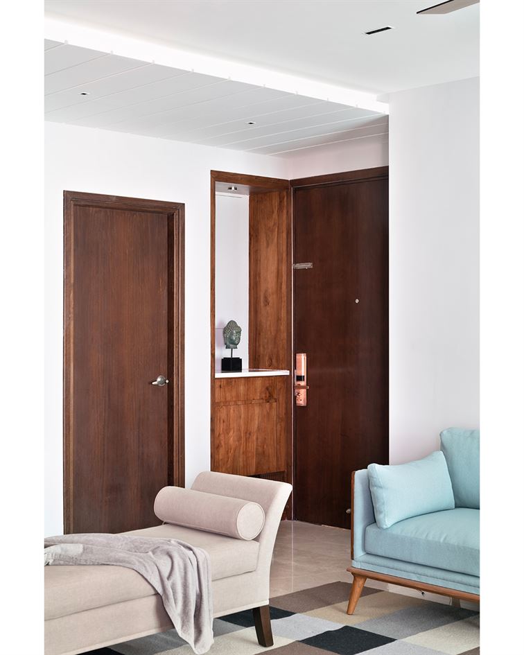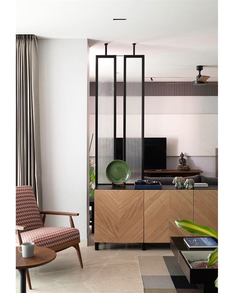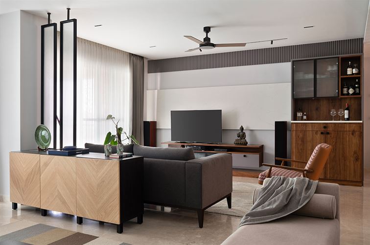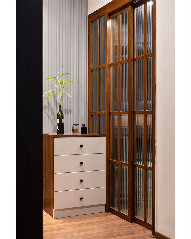 Modern Sanctuary begins with a warm, wood-paneled foyer that sets a calm, grounded tone. A subtle partition leads into the living area, where minimal furniture, neutral tones, and soft lighting come together to create an elegant, uncluttered space.